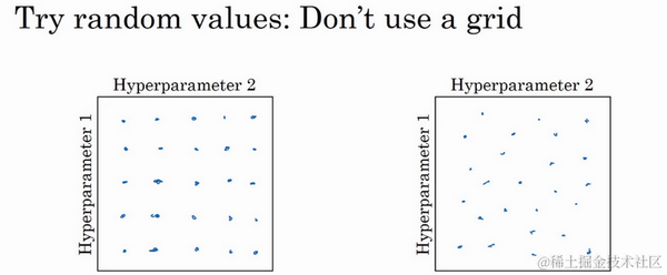 在深度学习领域,我们常做的,我推荐你采用下面的做法,随机选择点,所以你可以选择同等数量的点,对吗?25个点,接着,用这些随机取的点试验超参数的效果。之所以这么做是因为,对于你要解决的问题而言,你很难提前知道哪个超参数最重要,正如你之前看到的,一些超参数的确要比其它的更重要。