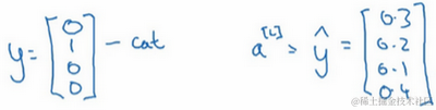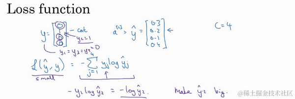 接下来我们来看怎样训练带有Softmax输出层的神经网络,具体而言,我们先定义训练神经网络使会用到的损失函数。举个例子,我们来看看训练集中某个样本的目标输出,真实标签是 ,用上一个视频中讲到过的例子,这表示这是一张猫的图片,因为它属于类1,现在我们假设你的神经网络输出的是 , 是一个包括总和为1的概率的向量, ,你可以看到总和为1,这就是 , 。对于这个样本神经网络的表现不佳,这实际上是一只猫,但却只分配到20%是猫的概率,所以在本例中表现不佳。