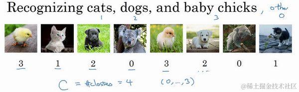 假设你不单需要识别猫,而是想识别猫,狗和小鸡,我把猫加做类1,狗为类2,小鸡是类3,如果不属于以上任何一类,就分到“其它”或者说“以上均不符合”这一类,我把它叫做类0。这里显示的图片及其对应的分类就是一个例子,这幅图片上是一只小鸡,所以是类3,猫是类1,狗是类2,我猜这是一只考拉,所以以上均不符合,那就是类0,下一个类3,以此类推。我们将会用符号表示,我会用大写的 来表示你的输入会被分入的类别总个数,在这个例子中,我们有4种可能的类别,包括“其它”或“以上均不符合”这一类。当有4个分类时,指示类别的数字,就是从0到 ,换句话说就是0、1、2、3。