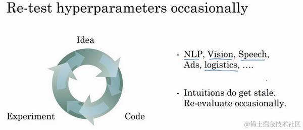 就超参数的设定而言,我见到过有些直觉想法变得很缺乏新意,所以,即使你只研究一个问题,比如说逻辑学,你也许已经找到一组很好的参数设置,并继续发展算法,或许在几个月的过程中,观察到你的数据会逐渐改变,或也许只是在你的数据中心更新了服务器,正因为有了这些变化,你原来的超参数的设定不再好用,所以我建议,或许只是重新测试或评估你的超参数,至少每隔几个月一次,以确保你对数值依然很满意。