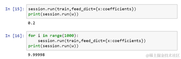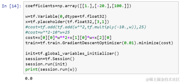 让我们再定义一个数组,coefficient = np.array([[1.],[-10.],[25.]]),这就是我们要接入 的数据。最后我们需要用某种方式把这个系数数组接入变量 ,做到这一点的句法是,在训练这一步中,要提供给 的数值,我在这里设置: