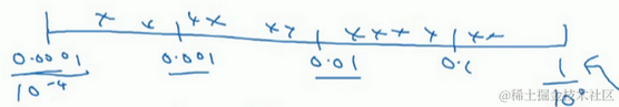 看看这个例子,假设你在搜索超参数 (学习速率),假设你怀疑其值最小是0.0001或最大是1。如果你画一条从0.0001到1的数轴,沿其随机均匀取值,那90%的数值将会落在0.1到1之间,结果就是,在0.1到1之间,应用了90%的资源,而在0.0001到0.1之间,只有10%的搜索资源,这看上去不太对。