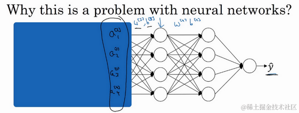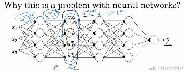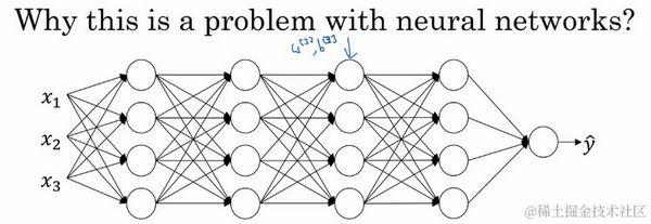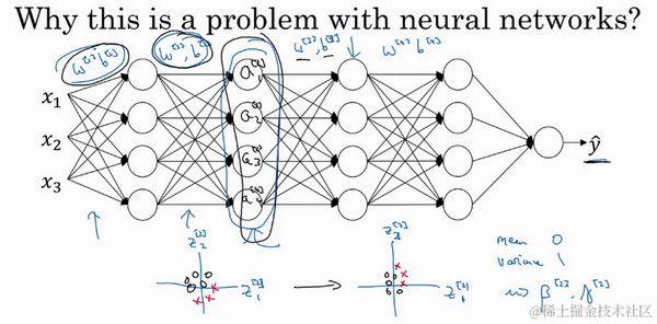 现在我们把网络的左边揭开,这个网络还有参数 , 和 , ,如果这些参数改变,这些 的值也会改变。所以从第三层隐藏层的角度来看,这些隐藏单元的值在不断地改变,所以它就有了“Covariate shift”的问题,上张幻灯片中我们讲过的。