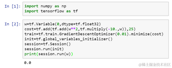#上面的这一行将w初始化为0,并定义损失函数,我们定义train为学习算法,它用梯度下降法优化器使损失函数最小化,但实际上我们还没有运行学习算法,所以#上面的这一行将w初始化为0,并定义损失函数,我们定义train为学习算法,它用梯度下降法优化器使损失函数最小化,但实际上我们还没有运行学习算法,所以session.run(w)评估了w,让我::