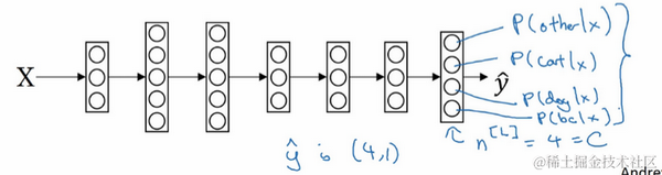 在这个例子中,我们将建立一个神经网络,其输出层有4个,或者说 个输出单元,因此 ,即输出层也就是 层的单元数量,等于4,或者一般而言等于 。我们想要输出层单元的数字告诉我们这4种类型中每个的概率有多大,所以这里的第一个节点(最后输出的第1个方格+圆圈)输出的应该是或者说我们希望它输出“其它”类的概率。在输入 的情况下,这个(最后输出的第2个方格+圆圈)会输出猫的概率。在输入 的情况下,这个会输出狗的概率(最后输出的第3个方格+圆圈)。在输入 的情况下,输出小鸡的概率(最后输出的第4个方格+圆圈),我把小鸡缩写为bc(baby chick)。因此这里的 将是一个 维向量,因为它必须输出四个数字,给你这四种概率,因为它们加起来应该等于1,输出中的四个数字加起来应该等于1。