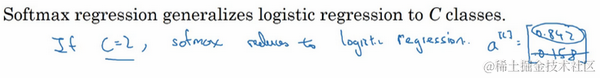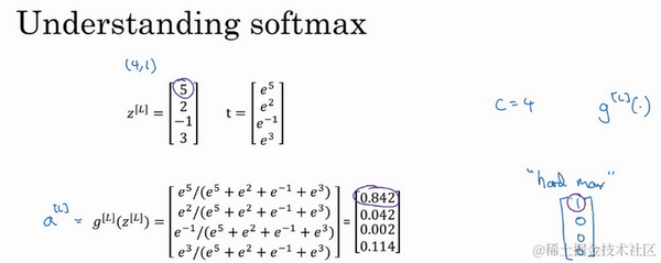 Softmax这个名称的来源是与所谓hardmax对比,hardmax会把向量 变成这个向量 ,hardmax函数会观察 的元素,然后在 中最大元素的位置放上1,其它位置放上0,所这是一个hard max,也就是最大的元素的输出为1,其它的输出都为0。与之相反,Softmax所做的从 到这些概率的映射更为温和,我不知道这是不是一个好名字,但至少这就是softmax这一名称背后所包含的想法,与hardmax正好相反。