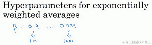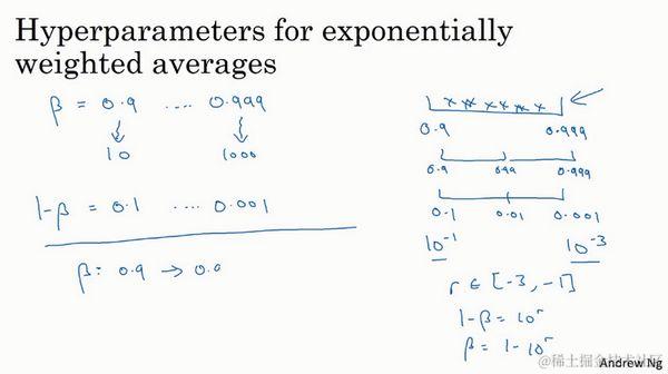 最后,另一个棘手的例子是给 取值,用于计算指数的加权平均值。假设你认为 是0.9到0.999之间的某个值,也许这就是你想搜索的范围。记住这一点,当计算指数的加权平均值时,取0.9就像在10个值中计算平均值,有点类似于计算10天的温度平均值,而取0.999就是在1000个值中取平均。