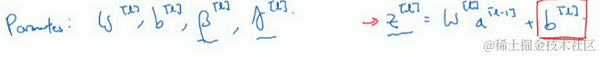 现在,我想澄清此参数的一个细节。先前我说过每层的参数是 和 ,还有 和 ,请注意计算 的方式如下, ,但Batch归一化做的是,它要看这个mini-batch,先将 归一化,结果为均值0和标准方差,再由 和 重新缩放,但这意味着,无论 的值是多少,都是要被减去的,因为在Batch归一化的过程中,你要计算 的均值,再减去平均值,在此例中的mini-batch中增加任何常数,数值都不会改变,因为加上的任何常数都将会被均值减去所抵消。