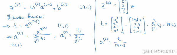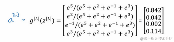 神经网络的输出 ,也就是 ,是一个4×1维向量,这个4×1向量的元素就是我们算出来的这四个数字( ),所以这种算法通过向量 计算出总和为1的四个概率。