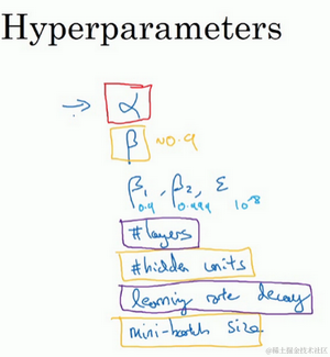 除了 ,还有一些参数需要调试,例如Momentum参数 ,0.9就是个很好的默认值。我还会调试mini-batch的大小,以确保最优算法运行有效。我还会经常调试隐藏单元,我用橙色圈住的这些,这三个是我觉得其次比较重要的,相对于 而言。重要性排第三位的是其他因素,层数有时会产生很大的影响,学习率衰减也是如此。当应用Adam算法时,事实上,我从不调试 , 和 ,我总是选定其分别为0.9,0.999和 ,如果你想的话也可以调试它们。