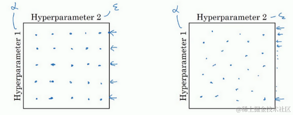 举个例子,假设超参数1是 (学习速率),取一个极端的例子,假设超参数2是Adam算法中,分母中的 。在这种情况下, 的取值很重要,而 取值则无关紧要。如果你在网格中取点,接着,你试验了 的5个取值,那你会发现,无论 取何值,结果基本上都是一样的。所以,你知道共有25种模型,但进行试验的 值只有5个,我认为这是很重要的。