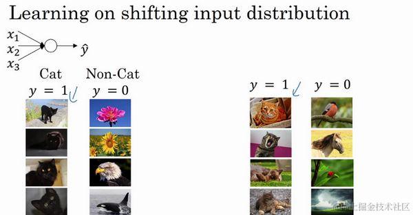 所以使你数据改变分布的这个想法,有个有点怪的名字“Covariate shift”,想法是这样的,如果你已经学习了 到 的映射,如果 的分布改变了,那么你可能需要重新训练你的学习算法。这种做法同样适用于,如果真实函数由 到 映射保持不变,正如此例中,因为真实函数是此图片是否是一只猫,训练你的函数的需要变得更加迫切,如果真实函数也改变,情况就更糟了。