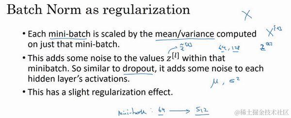 Batch归一化还有一个作用,它有轻微的正则化效果,Batch归一化中非直观的一件事是,每个mini-batch,我会说mini-batch 的值为 , ,在mini-batch计算中,由均值和方差缩放的,因为在mini-batch上计算的均值和方差,而不是在整个数据集上,均值和方差有一些小的噪声,因为它只在你的mini-batch上计算,比如64或128或256或更大的训练例子。因为均值和方差有一点小噪音,因为它只是由一小部分数据估计得出的。缩放过程从 到 ,过程也有一些噪音,因为它是用有些噪音的均值和方差计算得出的。