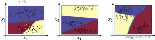 我们来看一下更多分类的例子,这个例子中(左边图) ,因此这个绿色分类和Softmax仍旧可以代表多种分类之间的这些类型的线性决策边界。另一个例子(中间图)是 类,最后一个例子(右边图)是 ,这显示了Softmax分类器在没有隐藏层的情况下能够做到的事情,当然更深的神经网络会有 ,然后是一些隐藏单元,以及更多隐藏单元等等,你就可以学习更复杂的非线性决策边界,来区分多种不同分类。