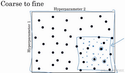 比如在二维的那个例子中,你进行了取值,也许你会发现效果最好的某个点,也许这个点周围的其他一些点效果也很好,那在接下来要做的是放大这块小区域(小蓝色方框内),然后在其中更密集得取值或随机取值,聚集更多的资源,在这个蓝色的方格中搜索,如果你怀疑这些超参数在这个区域的最优结果,那在整个的方格中进行粗略搜索后,你会知道接下来应该聚焦到更小的方格中。在更小的方格中,你可以更密集得取点。所以这种从粗到细的搜索也经常使用。