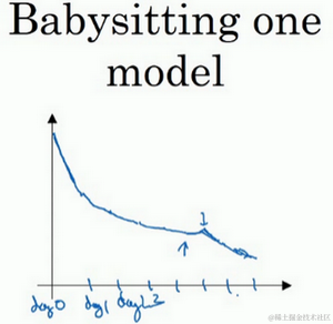 一种是你照看一个模型,通常是有庞大的数据组,但没有许多计算资源或足够的CPU和GPU的前提下,基本而言,你只可以一次负担起试验一个模型或一小批模型,在这种情况下,即使当它在试验时,你也可以逐渐改良。比如,第0天,你将随机参数初始化,然后开始试验,然后你逐渐观察自己的学习曲线,也许是损失函数J,或者数据设置误差或其它的东西,在第1天内逐渐减少,那这一天末的时候,你可能会说,看,它学习得真不错。我试着增加一点学习速率,看看它会怎样,也许结果证明它做得更好,那是你第二天的表现。两天后,你会说,它依旧做得不错,也许我现在可以填充下Momentum或减少变量。然后进入第三天,每天,你都会观察它,不断调整你的参数。也许有一天,你会发现你的学习率太大了,所以你可能又回归之前的模型,像这样,但你可以说是在每天花时间照看此模型,即使是它在许多天或许多星期的试验过程中。所以这是一个人们照料一个模型的方法,观察它的表现,耐心地调试学习率,但那通常是因为你没有足够的计算能力,不能在同一时间试验大量模型时才采取的办法。