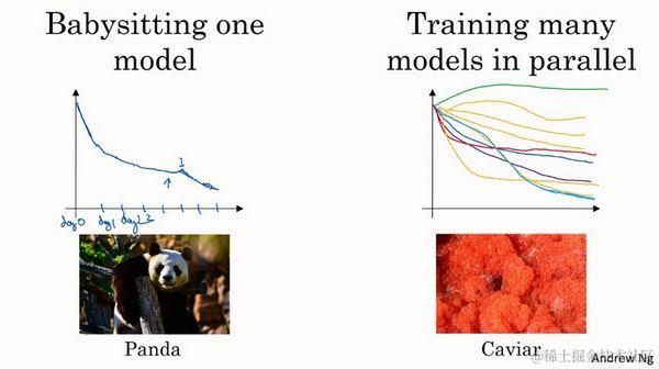所以这两种方式的选择,是由你拥有的计算资源决定的,如果你拥有足够的计算机去平行试验许多模型,那绝对采用鱼子酱方式,尝试许多不同的超参数,看效果怎么样。但在一些应用领域,比如在线广告设置和计算机视觉应用领域,那里的数据太多了,你需要试验大量的模型,所以同时试验大量的模型是很困难的,它的确是依赖于应用的过程。但我看到那些应用熊猫方式多一些的组织,那里,你会像对婴儿一样照看一个模型,调试参数,试着让它工作运转。尽管,当然,甚至是在熊猫方式中,试验一个模型,观察它工作与否,也许第二或第三个星期后,也许我应该建立一个不同的模型(绿色曲线),像熊猫那样照料它,我猜,这样一生中可以培育几个孩子,即使它们一次只有一个孩子或孩子的数量很少。
