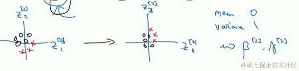 Batch归一化做的,是它减少了这些隐藏值分布变化的数量。如果是绘制这些隐藏的单元值的分布,也许这是重整值 ,这其实是 , ,我要绘制两个值而不是四个值,以便我们设想为2D,Batch归一化讲的是 , 的值可以改变,它们的确会改变,当神经网络在之前层中更新参数,Batch归一化可以确保无论其怎样变化 , 的均值和方差保持不变,所以即使 , 的值改变,至少他们的均值和方差也会是均值0,方差1,或不一定必须是均值0,方差1,而是由 和 决定的值。如果神经网络选择的话,可强制其为均值0,方差1,或其他任何均值和方差。但它做的是,它限制了在前层的参数更新,会影响数值分布的程度,第三层看到的这种情况,因此得到学习。