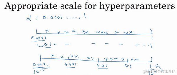 反而,用对数标尺搜索超参数的方式会更合理,因此这里不使用线性轴,分别依次取0.0001,0.001,0.01,0.1,1,在对数轴上均匀随机取点,这样,在0.0001到0.001之间,就会有更多的搜索资源可用,还有在0.001到0.01之间等等。