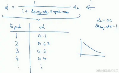 你应该拆分成不同的mini-batch,第一次遍历训练集叫做第一代。第二次就是第二代,依此类推,你可以将 学习率设为(decay-rate称为衰减率,epoch-num为代数, 为初始学习率),注意这个衰减率是另一个你需要调整的超参数。