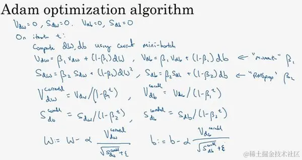 使用Adam算法,首先你要初始化, , , , ,在第 次迭代中,你要计算微分,用当前的mini-batch计算 , ,一般你会用mini-batch梯度下降法。接下来计算Momentum指数加权平均数,所以 (使用 ,这样就不会跟超参数 混淆,因为后面RMSprop要用到 ),使用Momentum时我们肯定会用这个公式,但现在不叫它 ,而叫它 。同样 。