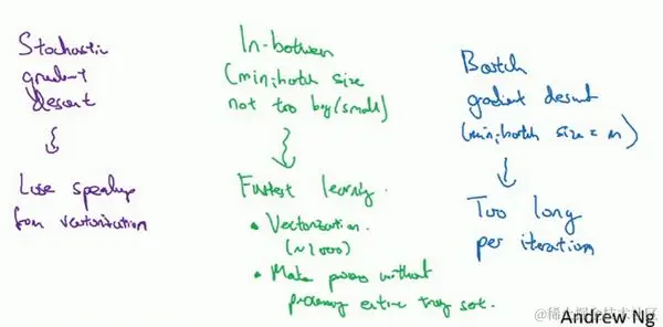 实际上你选择的mini-batch大小在二者之间,大小在1和 之间,而1太小了, 太大了,原因在于如果使用batch梯度下降法,mini-batch的大小为 ,每个迭代需要处理大量训练样本,该算法的主要弊端在于特别是在训练样本数量巨大的时候,单次迭代耗时太长。如果训练样本不大,batch梯度下降法运行地很好。