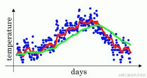 由于以后我们要考虑的原因,在计算时可视 大概是 的每日温度,如果 是0.9,你会想,这是十天的平均值,也就是红线部分。