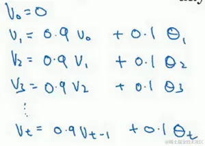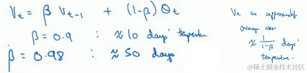 第二天,又可以获得一个加权平均数,0.9乘以之前的值加上当日的温度0.1倍,即 ,以此类推。