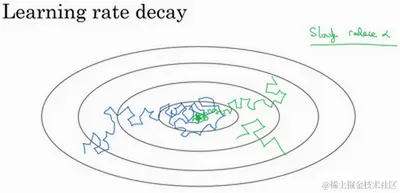 但要慢慢减少学习率 的话,在初期的时候, 学习率还较大,你的学习还是相对较快,但随着 变小,你的步伐也会变慢变小,所以最后你的曲线(绿色线)会在最小值附近的一小块区域里摆动,而不是在训练过程中,大幅度在最小值附近摆动。