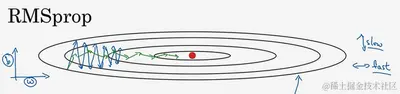 所以,你想减缓 方向的学习,即纵轴方向,同时加快,至少不是减缓横轴方向的学习,RMSprop算法可以实现这一点。