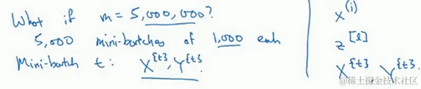 接下来我要说一个新的符号,把 到 称为 , 到 称为 ,如果你的训练样本一共有500万个,每个mini-batch都有1000个样本,也就是说,你有5000个mini-batch,因为5000乘以1000就是5000万。