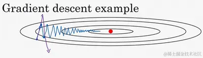 回忆一下我们之前的例子,如果你执行梯度下降,虽然横轴方向正在推进,但纵轴方向会有大幅度摆动,为了分析这个例子,假设纵轴代表参数 ,横轴代表参数 ,可能有 , 或者其它重要的参数,为了便于理解,被称为 和 。