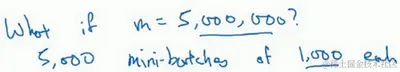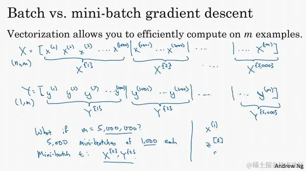 你可以把训练集分割为小一点的子集训练,这些子集被取名为mini-batch,假设每一个子集中只有1000个样本,那么把其中的 到 取出来,将其称为第一个子训练集,也叫做mini-batch,然后你再取出接下来的1000个样本,从 到 ,然后再取1000个样本,以此类推。