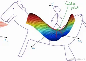 而不会碰到局部最优。至于为什么会把一个曲面叫做鞍点,你想象一下,就像是放在马背上的马鞍一样,如果这是马,这是马的头,这就是马的眼睛,画得不好请多包涵,然后你就是骑马的人,要坐在马鞍上,因此这里的这个点,导数为0的点,这个点叫做鞍点。我想那确实是你坐在马鞍上的那个点,而这里导数为0。