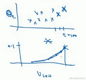 所以这是一个加和并平均,100号数据,也就是当日温度。我们分析 的组成,也就是在一年第100天计算的数据,但是这个是总和,包括100号数据,99号数据,97号数据等等。画图的一个办法是,假设我们有一些日期的温度,所以这是数据,这是 ,所以100号数据有个数值,99号数据有个数值,98号数据等等, 为100,99,98等等,这就是数日的温度数值。