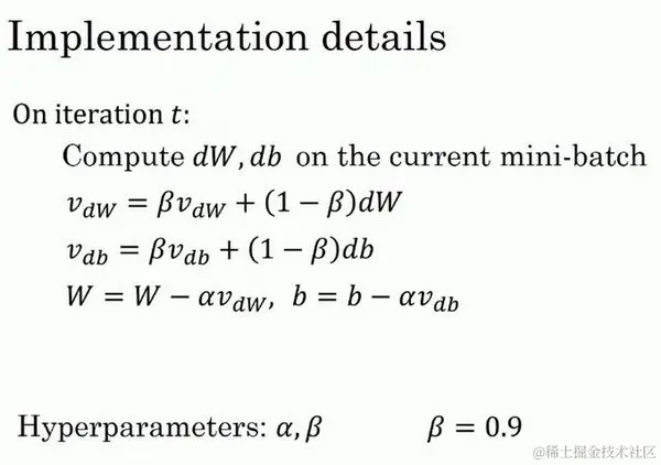 现在解释一下算法,可以将 , , 等等写成明确的变量,不过在实际中执行的话,你要做的是,一开始将 初始化为0,然后在第一天使 ,然后第二天,更新 值, ,以此类推,有些人会把 加下标,来表示 是用来计算数据的指数加权平均数。