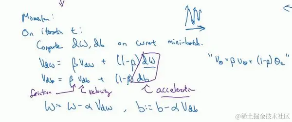 想象你有一个碗,你拿一个球,微分项给了这个球一个加速度,此时球正向山下滚,球因为加速度越滚越快,而因为 稍小于1,表现出一些摩擦力,所以球不会无限加速下去,所以不像梯度下降法,每一步都独立于之前的步骤,你的球可以向下滚,获得动量,可以从碗向下加速获得动量。我发现这个球从碗滚下的比喻,物理能力强的人接受得比较好,但不是所有人都能接受,如果球从碗中滚下这个比喻,你理解不了,别担心。