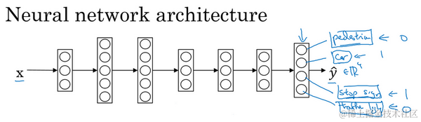 那么你现在可以做的是训练一个神经网络,来预测这些 值,你就得到这样的神经网络,输入 ,现在输出是一个四维向量 。请注意,这里输出我画了四个节点,所以第一个节点就是我们想预测图中有没有行人,然后第二个输出节点预测的是有没有车,这里预测有没有停车标志,这里预测有没有交通灯,所以这里 是四维的。