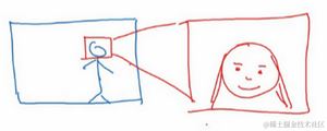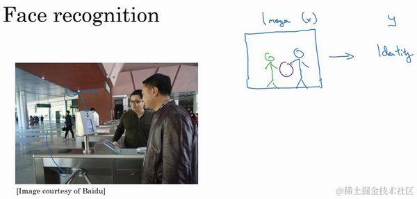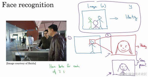 那么,怎么搭建这样的系统呢?你可以做的第一件事是,看看相机拍到的照片,对吧?我想我画的不太好,但也许这是相机照片,你知道,有人接近门禁了,所以这可能是相机拍到的图像 。有件事你可以做,就是尝试直接学习图像 到人物 身份的函数映射,事实证明这不是最好的方法。其中一个问题是,人可以从很多不同的角度接近门禁,他们可能在绿色位置,可能在蓝色位置。有时他们更靠近相机,所以他们看起来更大,有时候他们非常接近相机,那照片中脸就很大了。在实际研制这些门禁系统时,他不是直接将原始照片喂到一个神经网络,试图找出一个人的身份。