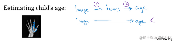 你可以想象一下如何将这个问题分解成两个步骤,第一步是一个比较简单的问题,也许你不需要那么多数据,也许你不需要许多X射线图像来切分骨骼。而任务二,收集儿童手部的骨头长度的统计数据,你不需要太多数据也能做出相当准确的估计,所以这个多步方法看起来很有希望,也许比端对端方法更有希望,至少直到你能获得更多端到端学习的数据之前。