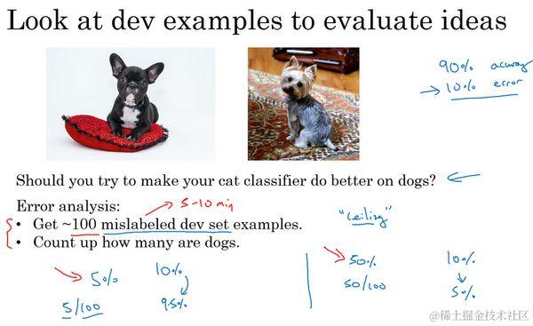 但现在,假设发生了另一件事,假设我们观察一下这100个错误标记的开发集样本,你发现实际有50张图都是狗,所以有50%都是狗的照片,现在花时间去解决狗的问题可能效果就很好。这种情况下,如果你真的解决了狗的问题,那么你的错误率可能就从10%下降到5%了。然后你可能觉得让错误率减半的方向值得一试,可以集中精力减少错误标记的狗图的问题。