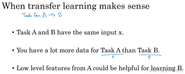 所以总结一下,什么时候迁移学习是有意义的?如果你想从任务 学习并迁移一些知识到任务 ,那么当任务 和任务 都有同样的输入 时,迁移学习是有意义的。在第一个例子中, 和 的输入都是图像,在第二个例子中,两者输入都是音频。当任务 的数据比任务 多得多时,迁移学习意义更大。所有这些假设的前提都是,你希望提高任务 的性能,因为任务 每个数据更有价值,对任务 来说通常任务 的数据量必须大得多,才有帮助,因为任务 里单个样本的价值没有比任务 单个样本价值大。然后如果你觉得任务 的低层次特征,可以帮助任务 的学习,那迁移学习更有意义一些。