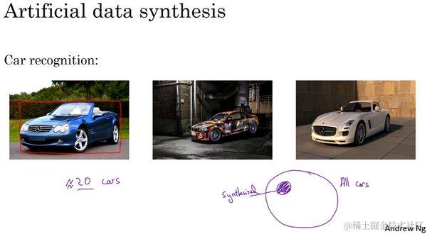 但是通过人工数据合成,你可以快速制造更多的训练数据,就像真的在车里录的那样,那就不需要花时间实际出去收集数据,比如说在实际行驶中的车子,录下上万小时的音频。所以,如果错误分析显示你应该尝试让你的数据听起来更像在车里录的,那么人工合成那种音频,然后喂给你的机器学习算法,这样做是合理的。