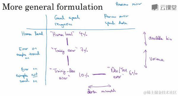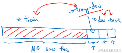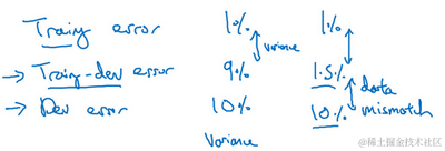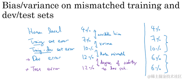 我们要做的是随机打散训练集,然后分出一部分训练集作为训练-开发集(training-dev),就像开发集和测试集来自同一分布,训练集、训练-开发集也来自同一分布。