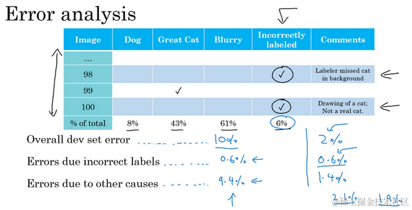 我给你看一个样本,解释清楚我的意思。所以我建议你看3个数字来确定是否值得去人工修正标记出错的数据,我建议你看看整体的开发集错误率,在我们以前的视频中的样本,我们说也许我们的系统达到了90%整体准确度,所以有10%错误率,那么你应该看看错误标记引起的错误的数量或者百分比。所以在这种情况下,6%的错误来自标记出错,所以10%的6%就是0.6%。也许你应该看看其他原因导致的错误,如果你的开发集上有10%错误,其中0.6%是因为标记出错,剩下的占9.4%,是其他原因导致的,比如把狗误认为猫,大猫图片。所以在这种情况下,我说有9.4%错误率需要集中精力修正,而标记出错导致的错误是总体错误的一小部分而已,所以如果你一定要这么做,你也可以手工修正各种错误标签,但也许这不是当下最重要的任务。