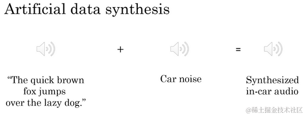 你可以利用的其中一种技术是人工合成数据(artificial data synthesis),我们讨论一下。在解决汽车噪音问题的场合,所以要建立语音识别系统。也许实际上你没那么多实际在汽车背景噪音下录得的音频,或者在高速公路背景噪音下录得的音频。但我们发现,你可以合成。所以假设你录制了大量清晰的音频,不带车辆背景噪音的音频,“The quick brown fox jumps over the lazy dog”(音频播放),所以,这可能是你的训练集里的一段音频,顺便说一下,这个句子在AI测试中经常使用,因为这个短句包含了从a到z所有字母,所以你会经常见到这个句子。但是,有了这个“the quick brown fox jumps over the lazy dog”这段录音之后,你也可以收集一段这样的汽车噪音,(播放汽车噪音音频)这就是汽车内部的背景噪音,如果你一言不发开车的话,就是这种声音。如果你把两个音频片段放到一起,你就可以合成出"the quick brown fox jumps over the lazy dog"(带有汽车噪声),在汽车背景噪音中的效果,听起来像这样,所以这是一个相对简单的音频合成例子。在实践中,你可能会合成其他音频效果,比如混响,就是声音从汽车内壁上反弹叠加的效果。