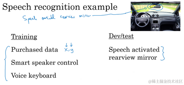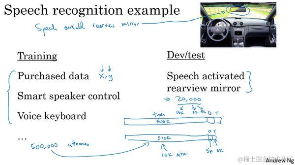 嗯,也许你已经在语音识别领域上工作了很久,所以你有很多来自其他语音识别应用的数据,它们并不是来自语音激活后视镜的数据。现在我讲讲如何分配训练集、开发集和测试集。对于你的训练集,你可以将你拥有的所有语音数据,从其他语音识别问题收集来的数据,比如这些年你从各种语音识别数据供应商买来的数据,今天你可以直接买到成 , 对的数据,其中 是音频剪辑, 是听写记录。或者也许你研究过智能音箱,语音激活音箱,所以你有一些数据,也许你做过语音激活键盘的开发之类的。