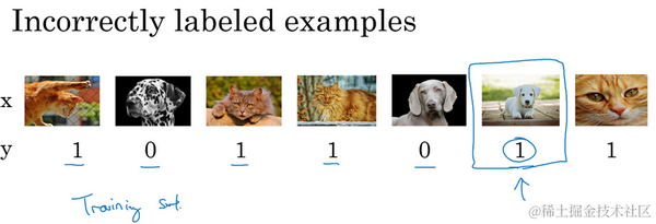 我们看看在猫分类问题中,图片是猫, ;不是猫, 。所以假设你看了一些数据样本,发现这(倒数第二张图片)其实不是猫,所以这是标记错误的样本。我用了这个词,“标记错误的样本”来表示你的学习算法输出了错误的 值。但我要说的是,对于标记错误的样本,参考你的数据集,在训练集或者测试集 的标签,人类给这部分数据加的标签,实际上是错的,这实际上是一只狗,所以 其实应该是0,也许做标记的那人疏忽了。如果你发现你的数据有一些标记错误的样本,你该怎么办?