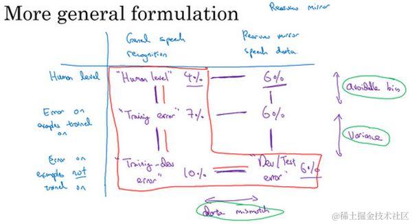 我们看看这张幻灯片里做了什么,然后写出一般的原则,我们要看的关键数据是人类水平错误率,你的训练集错误率,训练-开发集错误率,所以这分布和训练集一样,但你没有直接在上面训练。根据这些错误率之间差距有多大,你可以大概知道,可避免偏差、方差数据不匹配问题各自有多大。