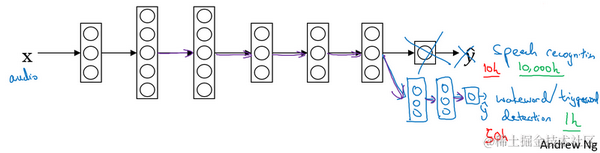 对于语音识别,也许你已经用10,000小时数据训练过你的语言识别系统,所以你从这10,000小时数据学到了很多人类声音的特征,这数据量其实很多了。但对于触发字检测,也许你只有1小时数据,所以这数据太小,不能用来拟合很多参数。所以在这种情况下,预先学到很多人类声音的特征人类语言的组成部分等等知识,可以帮你建立一个很好的唤醒字检测器,即使你的数据集相对较小。对于唤醒词任务来说,至少数据集要小得多。